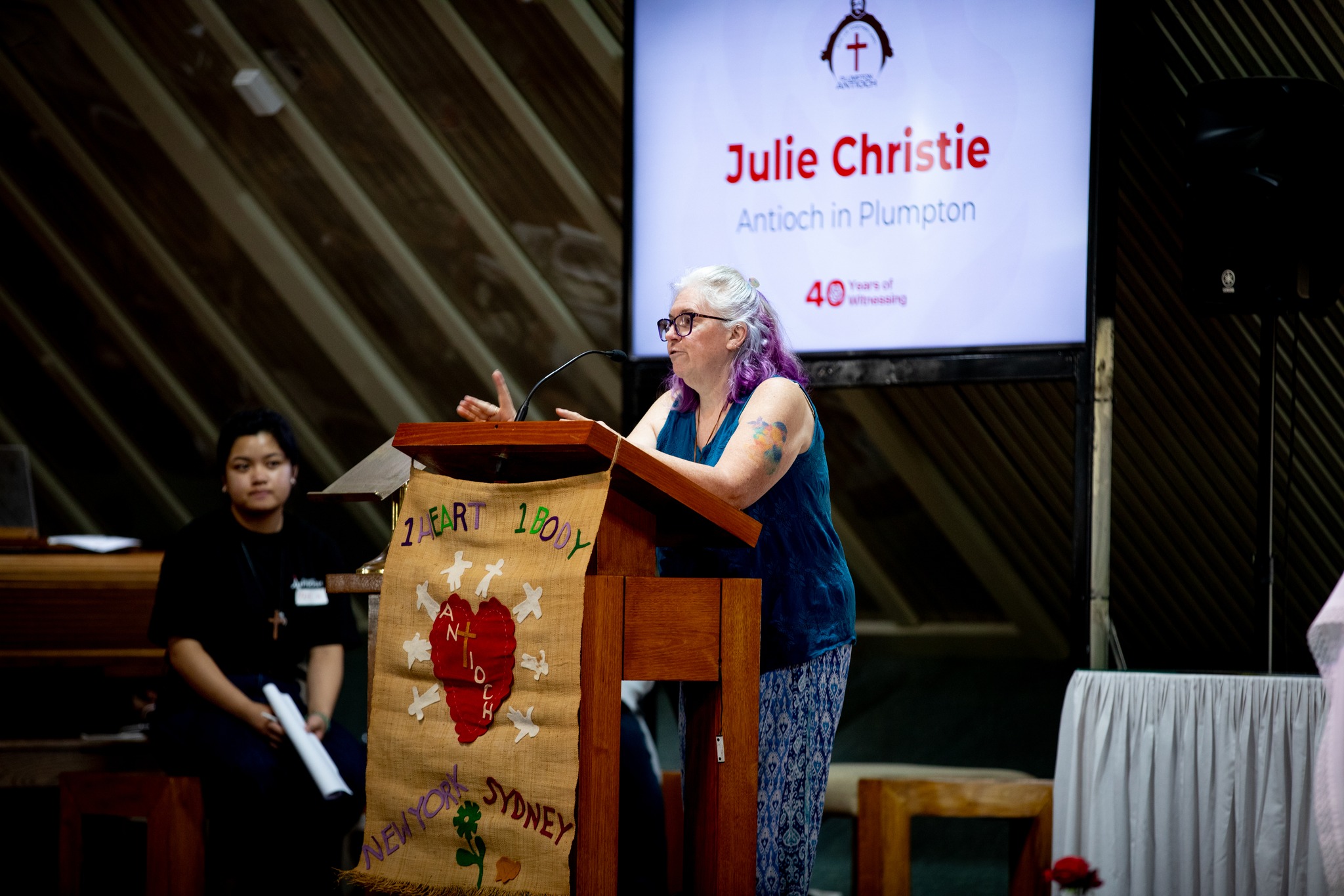 Former Antioch member Julie Christie speaks during the 40th anniversary celebrations of the Antioch youth ministry at The Good Shepherd Parish, Plumpton. Image: The Good Shepherd Parish/Facebook...