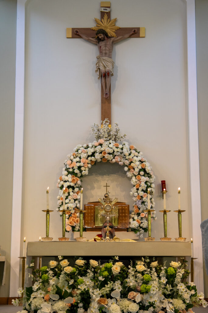 As the Blessed Sacrament moved into the church, parishioners paused in Benediction before Mass was celebrated for the feast day.