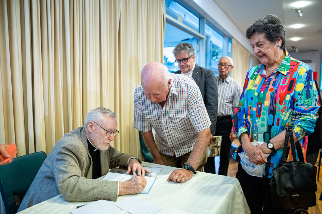 Monsignor Boyle signing copies of Tested By Fire. Image: Alphonsus Fok/ Diocese of Parramatta