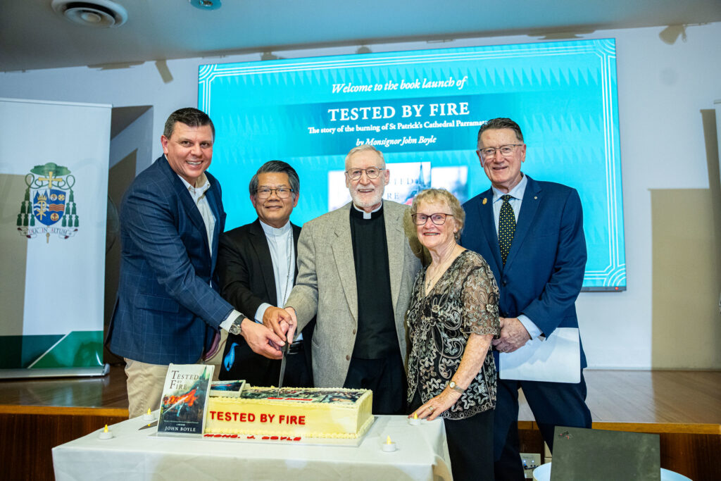 Called Tested By Fire, the book was officially launched by Bishop Vincent Long OFM Conv, Bishop of Parramatta, at the Cathedral’s Cloister Hall on Friday, 31 October, in front of more than 200 people, many of whom witnessed the fire or were involved in the rescue and rebuilding afterwards.