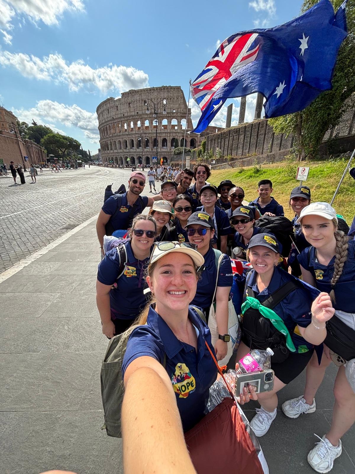 Diocese of Parramatta pilgrims outside the Colosseum during the pilgrimage walk to the Jubilee of Youth vigil in Rome. Image: Hannah Portelli/Diocese of Parramatta...