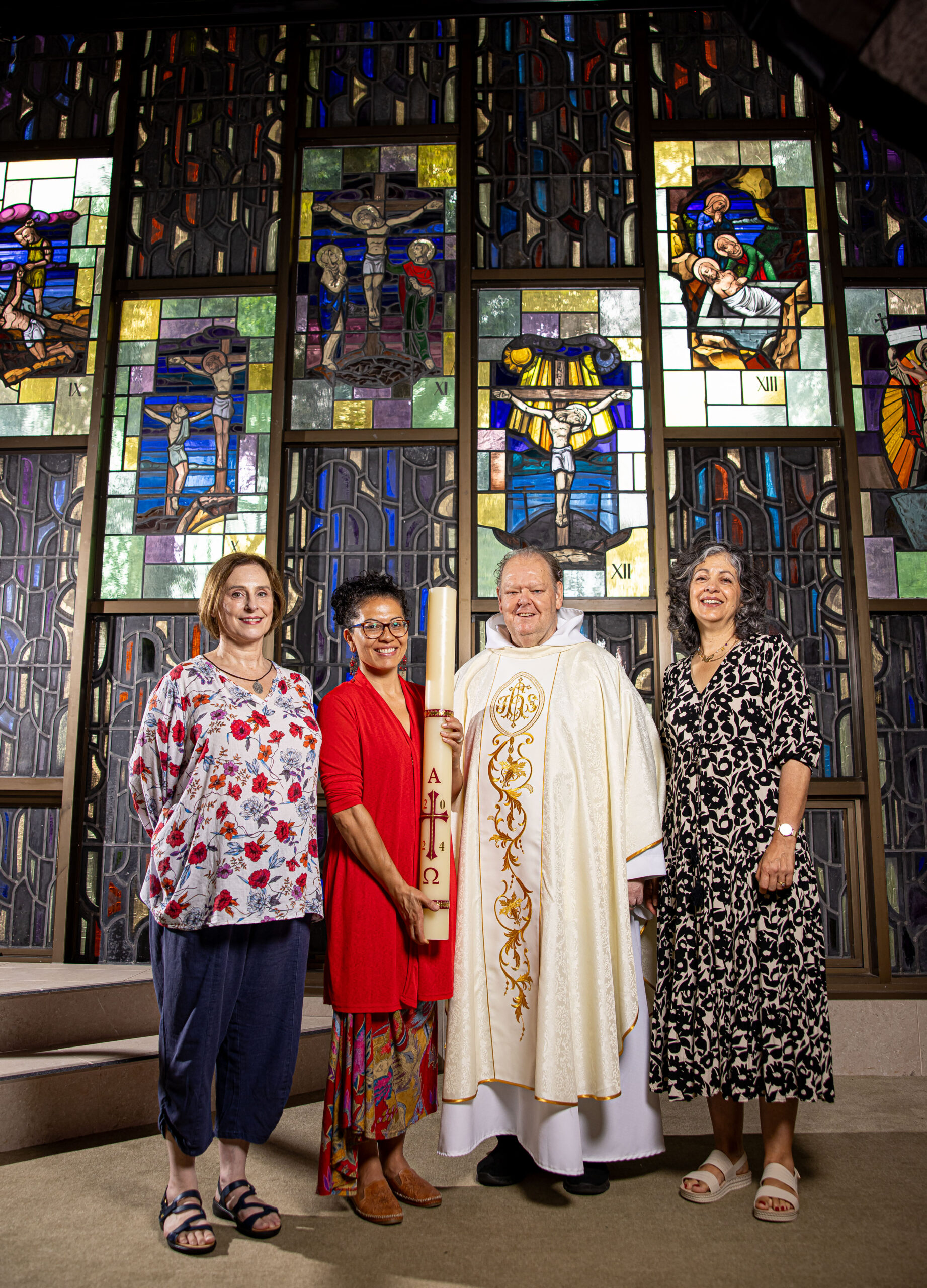 Angela Barlow (right) with Parish Priest Fr Christopher Shorrock OFM Conv and parish support team members Catherine Bareham (left) and Angela Rosero. Image: Alphonsus Fok/Diocese of Parramatta...