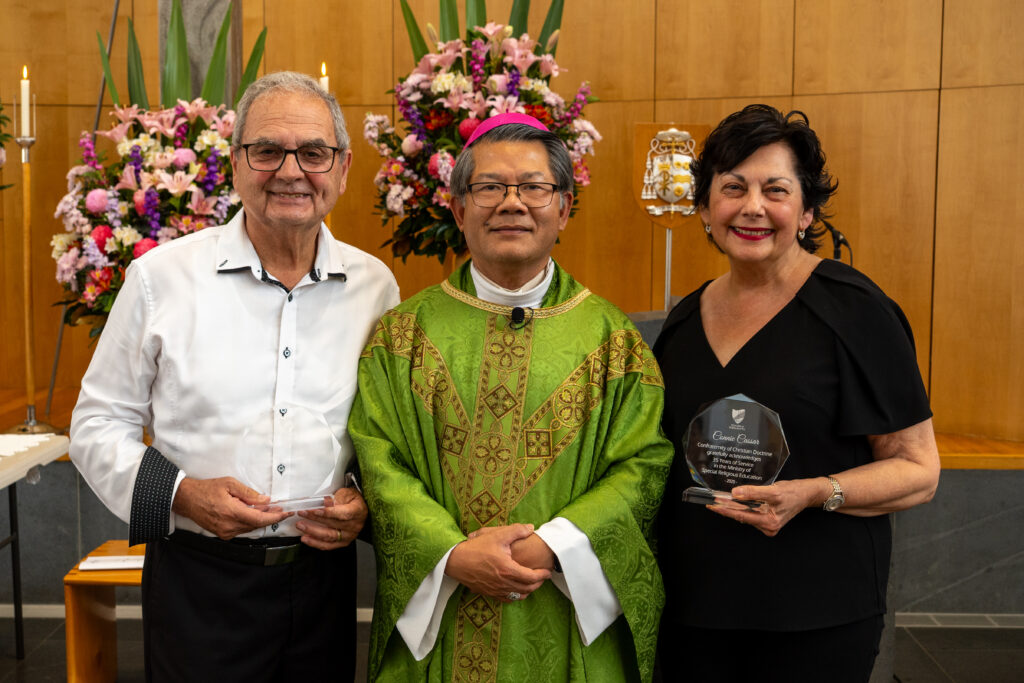Bishop Vincent with 35 years of service award recipients Sam (left) and Connie Cassar during the 2025 Confraternity of Christian Doctrine (CCD) Mass and Awards Presentation at St Patrick’s Cathedral, Parramatta. Image: Mary Brazell/Diocese of Parramatta