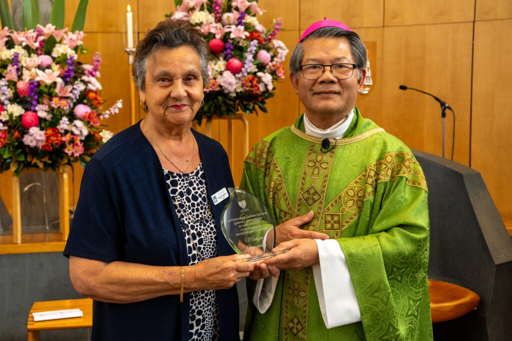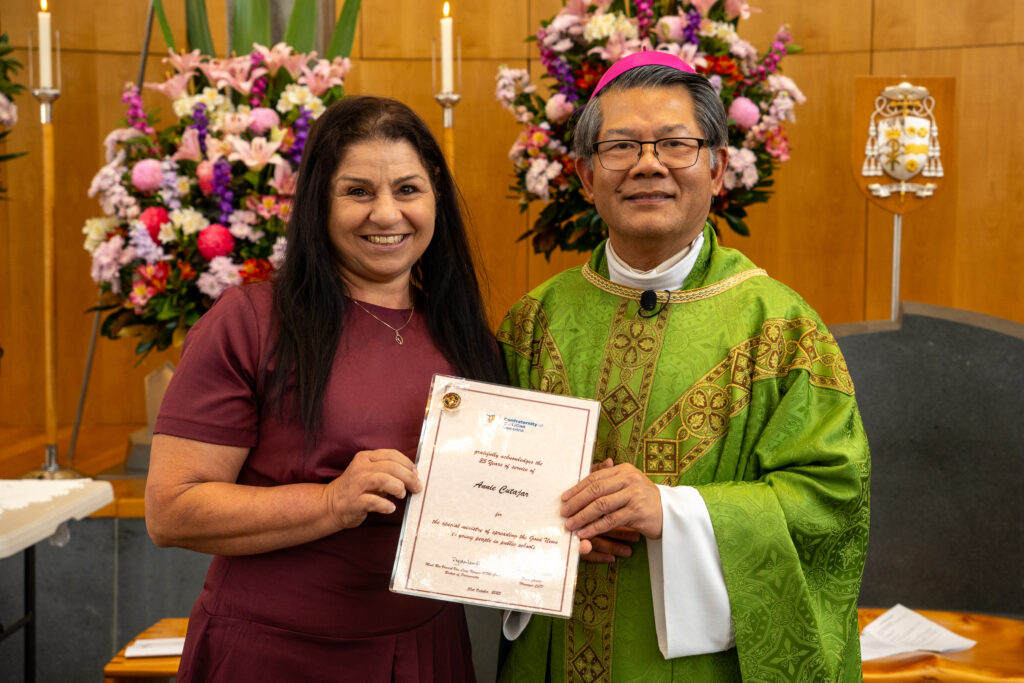 Annie Cutajar with Bishop Vincent Long OFM Conv, Bishop of Parramatta, during the 2025 Confraternity of Christian Doctrine (CCD) Mass and Awards Presentation at St Patrick’s Cathedral, Parramatta. Image: Mary Brazell/Diocese of Parramatta
