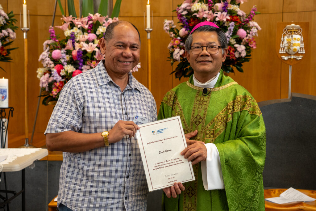 Bishop Vincent with retiring parish coordinator Erick Opena during the 2025 Confraternity of Christian Doctrine (CCD) Mass and Awards Presentation at St Patrick’s Cathedral, Parramatta. Image: Mary Brazell/Diocese of Parramatta
