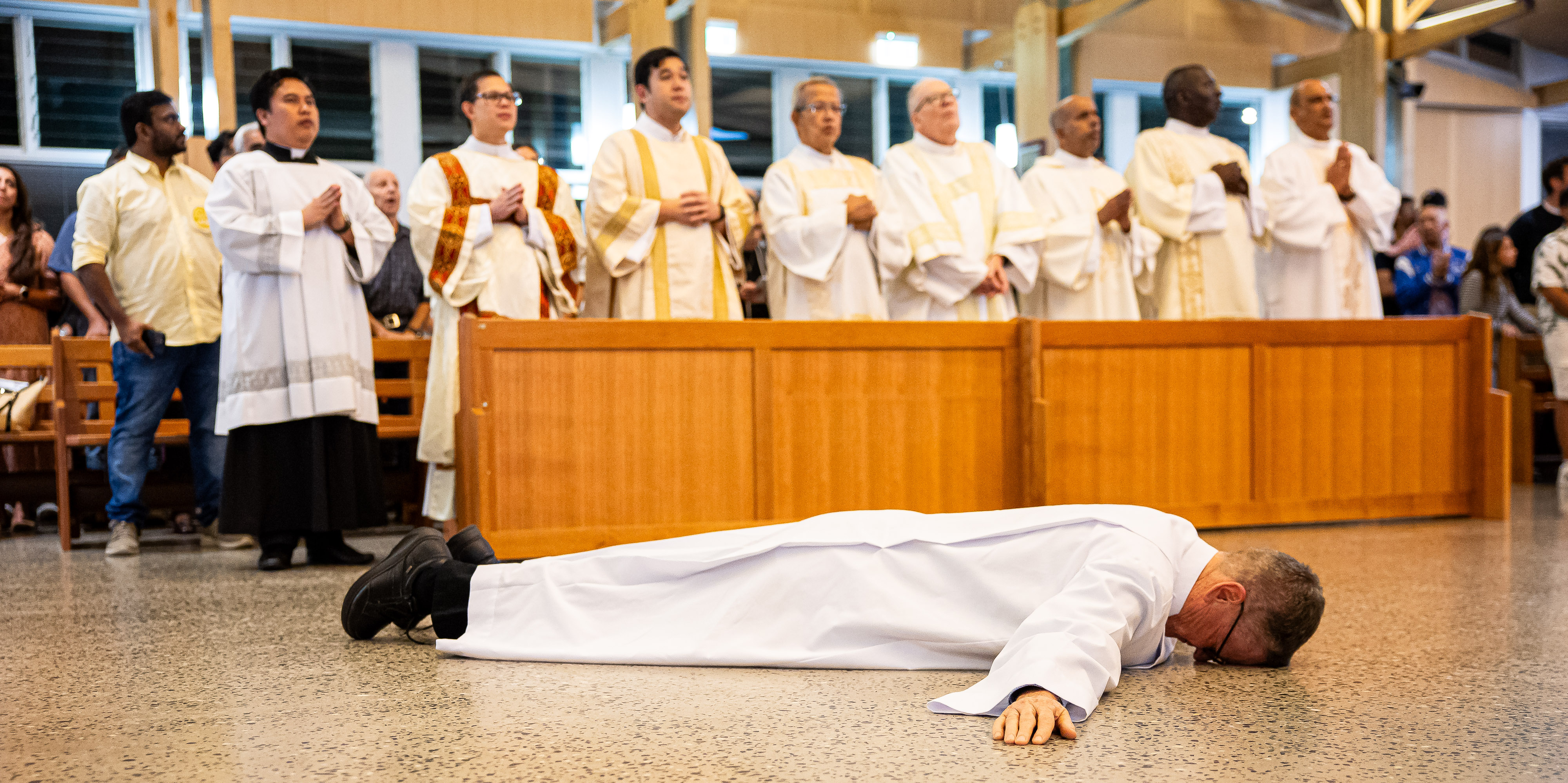 Jeff Hood lies prostrate in front of the altar during his ordination to the diaconate at St John XXIII Parish, Glenwood-Stanhope Gardens on Sunday 26 April 2026. Image: Jazz Chalouhi / threetwoone.com.au