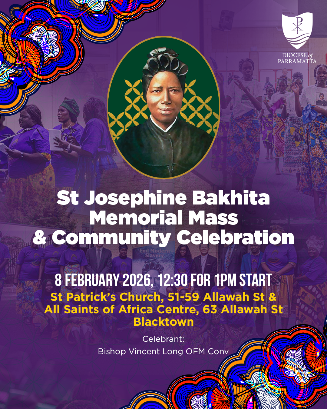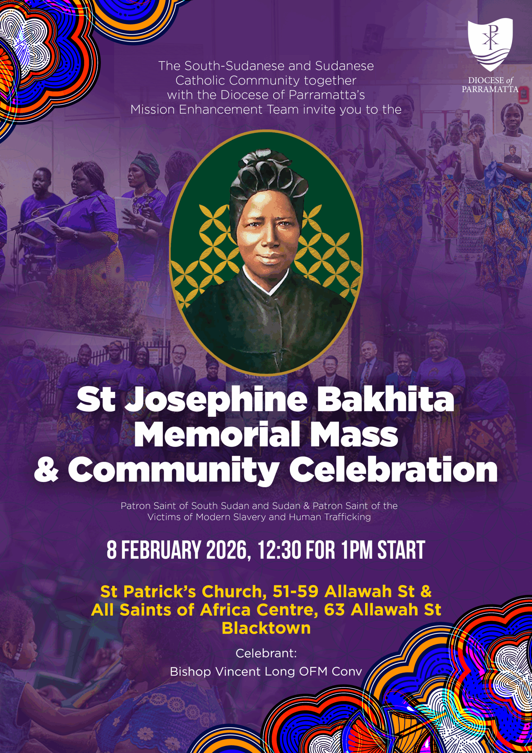 You are warmly invited to the annual St Josephine Bakhita Memorial Mass & Community Celebration on Sunday 8 February at 12:30pm at St Patrick’s Church, MQOF Parish, Blacktown. The South-Sudanese and Sudanese Catholic Community, supported by the Mission Enhancement Team, will celebrate their national patron saint, share their spirituality, culture and cuisine, and pray for the victims of modern slavery and human trafficking. All are welcome to attend.