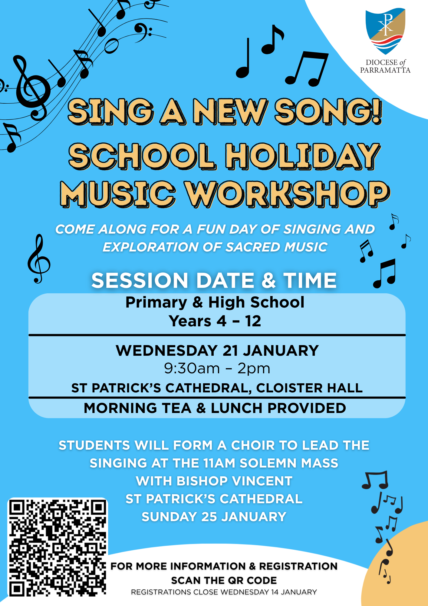 Do you have a child in Year 4-12? Invite them to come along to our ‘Sing A New Song Holiday Music Workshop’, for a fun day of singing and exploration of sacred music. The workshop will be held on Wednesday 21 January from 9:30am to 2pm at St Patrick’s Cathedral Hall, Parramatta. Morning tea and lunch provided. Student participants will form a choir that will sing at the Solemn Mass at St Patrick’s Cathedral Parramatta on Sunday 25 January at 11am. To register, please visit https://forms.office.com/r/0URuFAeThA