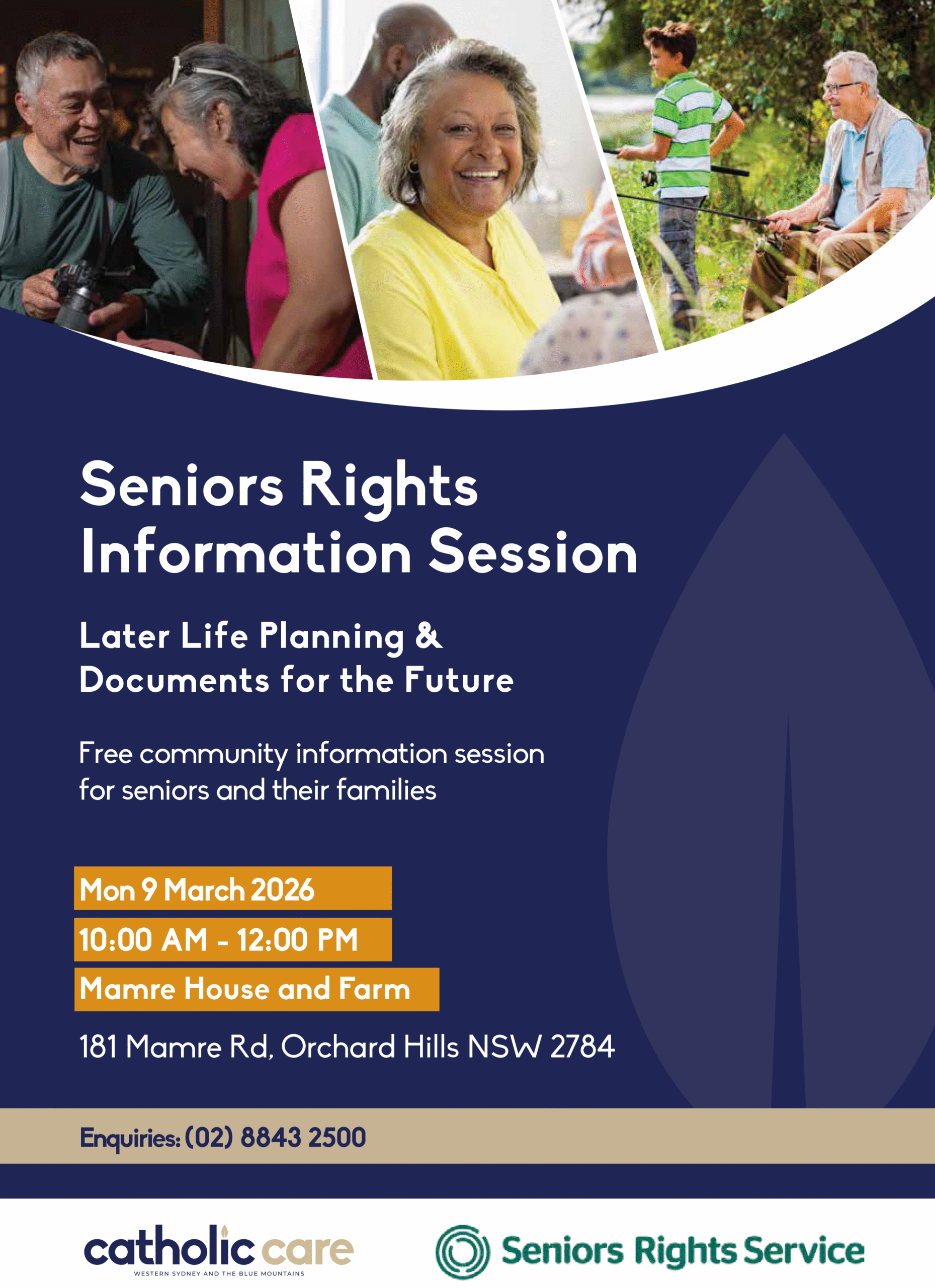 Free community information session for seniors and their families. 9th and 11th March at Orchard Hills, Springwood and Emerton. For more information, please contact Catholic Care on (02) 8843 2500.