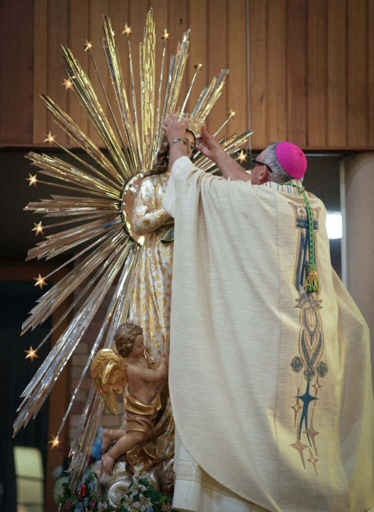 Bishop Anton Tuema, Bishop of Gozo, Malta, adorned the statue of Our Lady of Victories with a crown during Mass in celebration of the 60th anniversary of Festa at Our Lady, Queen of Peace Parish, Greystanes. Image: Supplied