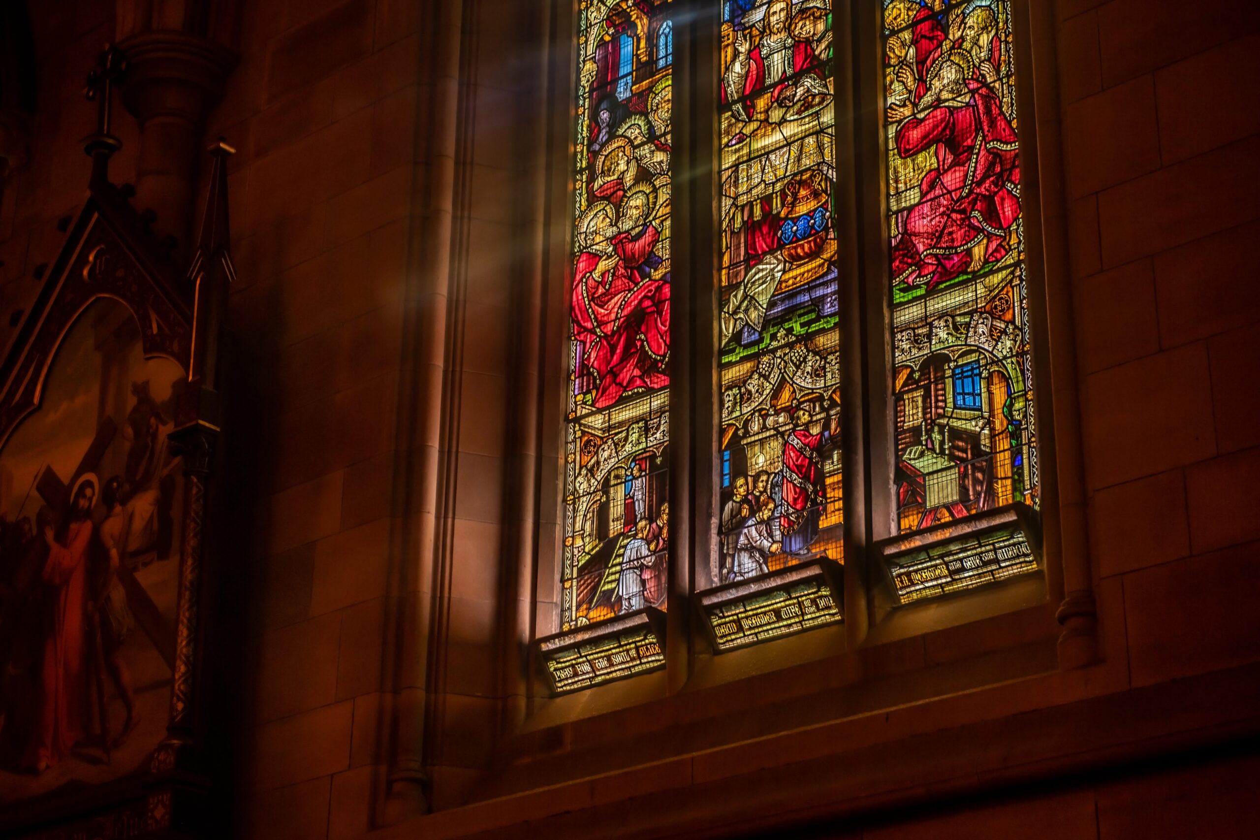 A depiction of the early Sydney worshipping community in a stained-glass window at St Mary's Cathedral, Sydney. Image: Giovanni Portelli/Supplied...