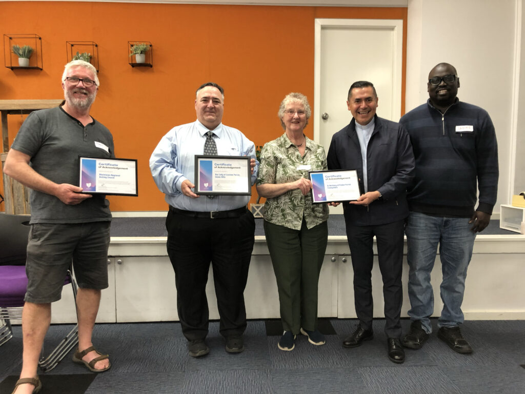 Vicar General Fr Fernando Montano (second right) with parishioners Paul (left) and Anne (centre) from St Anthony of Padua Parish, Toongabbie, and Terry (second left) from Our Lady of Lourdes Parish, Seven Hills, during a Diocesan Social Justice Networking and Formation Day acknowledging parishes who participated in the Community Refugee Integration and Settlement Pilot (CRISP) and the Community Support Program (CSP), at the Bishop Bede Heather Centre, Blacktown. Image: Diocese of Parramatta