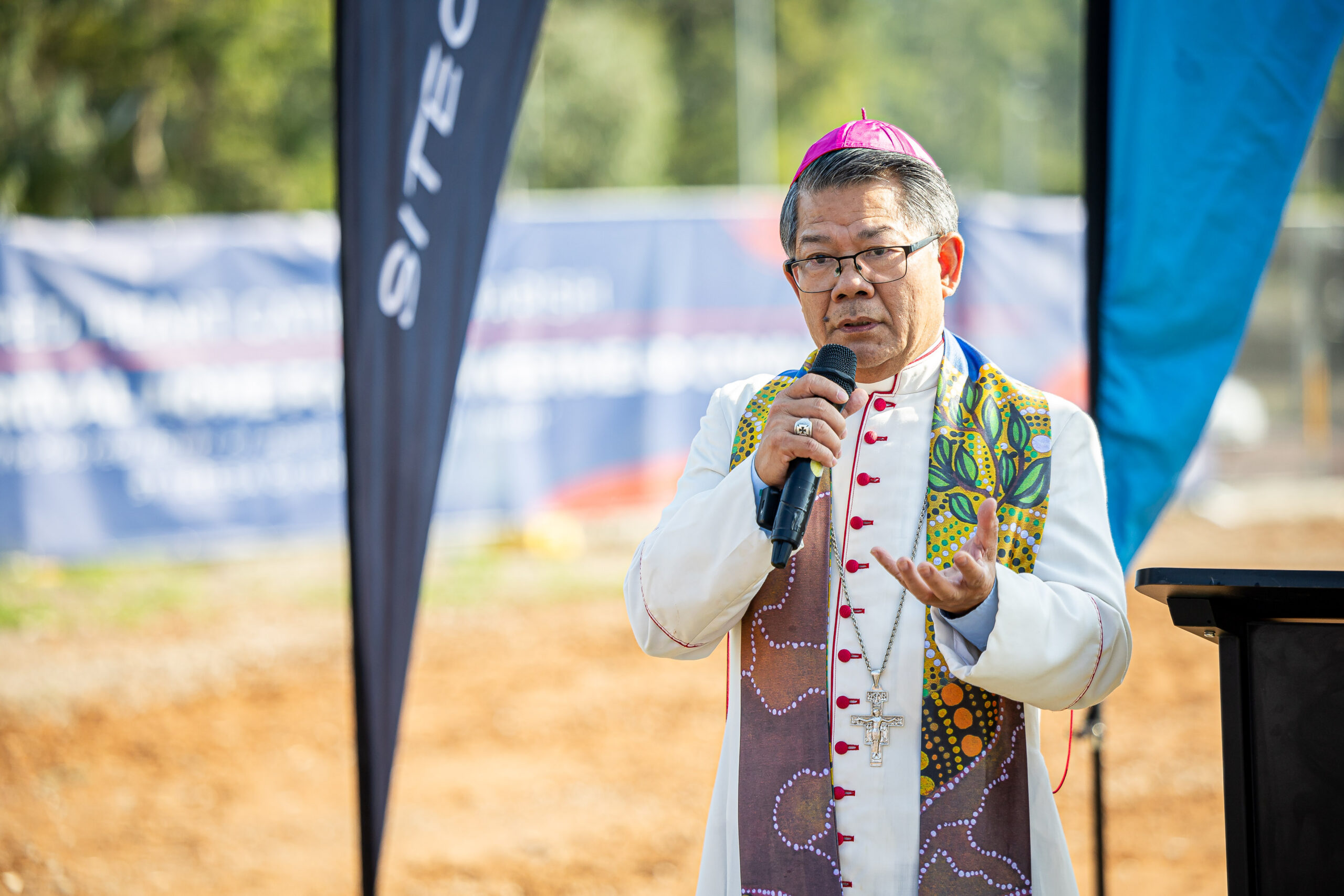 Bishop Vincent Long OFM Conv, Bishop of Parramatta, speaks during the sod turning ceremony for the new Sacred Heart Parish church at Westmead. Image: Alphonsus Fok/Diocese of Parramatta...