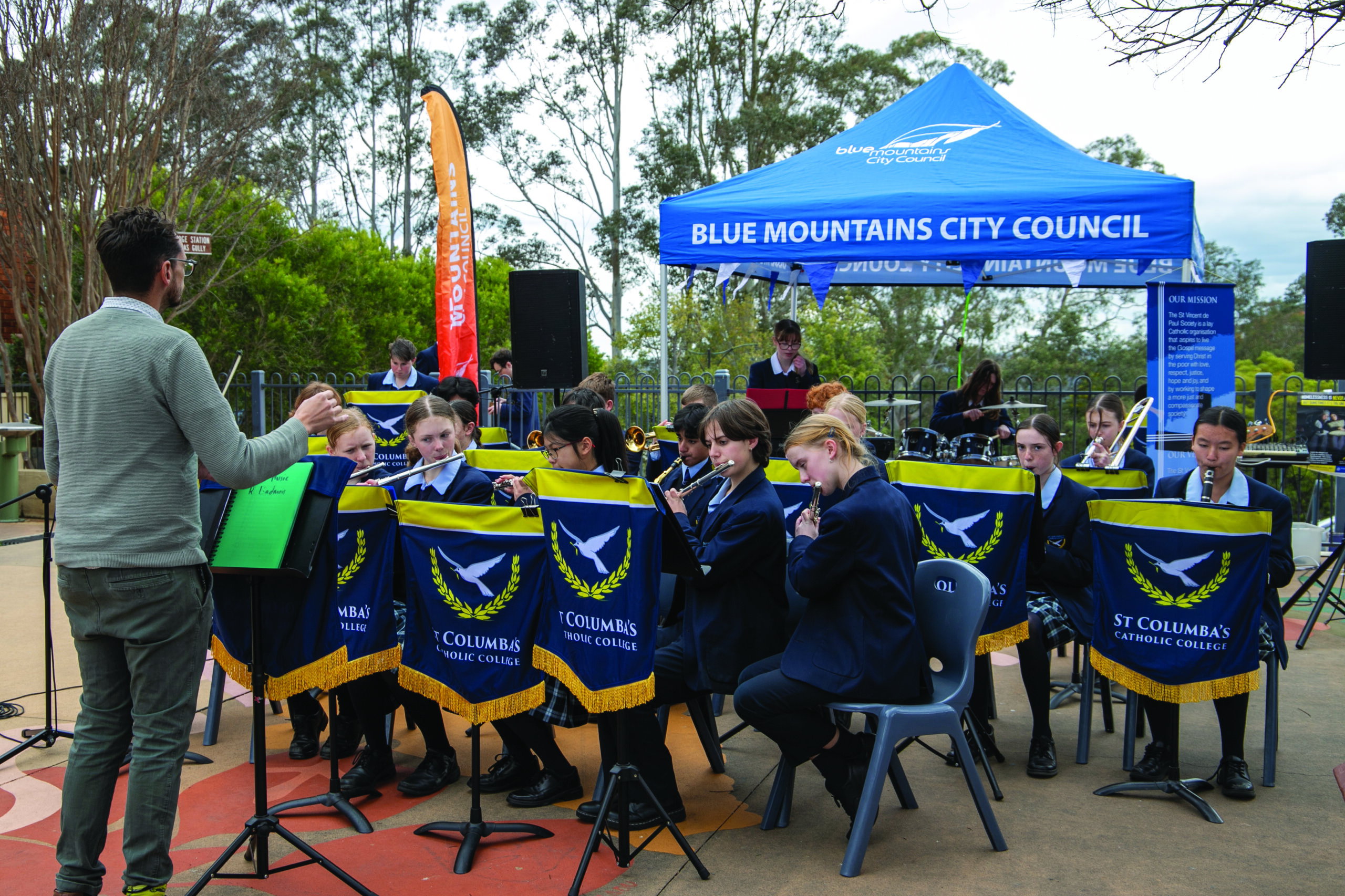 Students from St Columba’s Catholic College Springwood during a ‘Busking for Vinnies’ event in the main street of Springwood. Image: Mary Brazell/Diocese of Parramatta