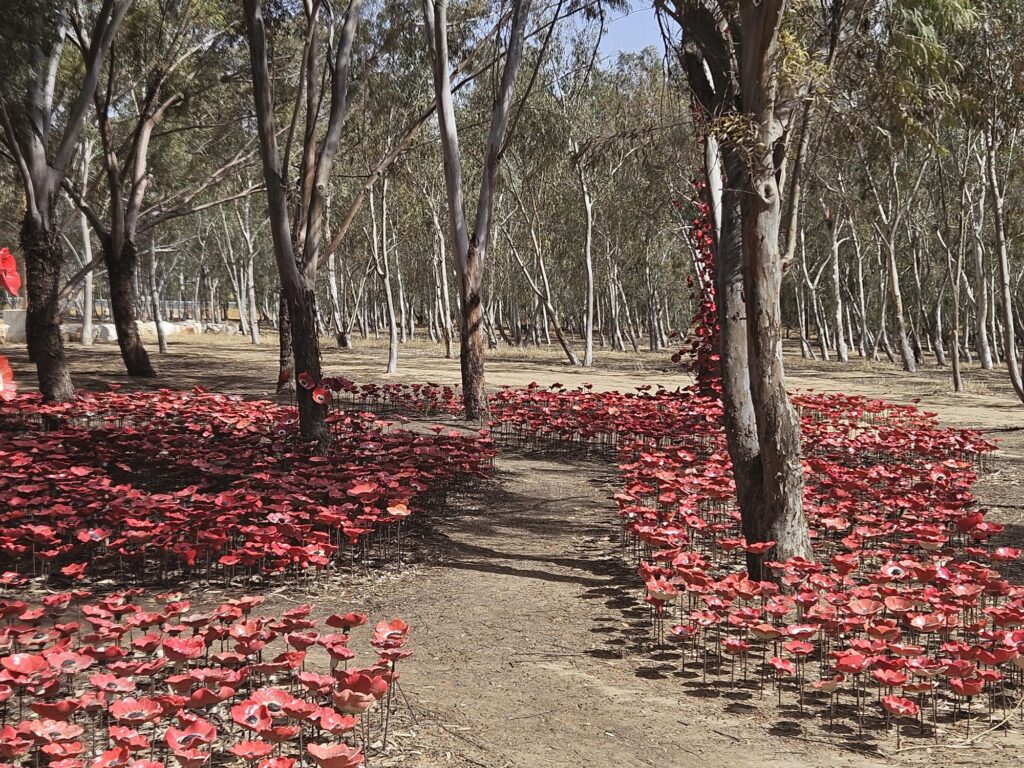 A poppy memorial at the site of the Nova Music Festival massacre, in May 2025. Image: Teresa Pirola/Supplied
