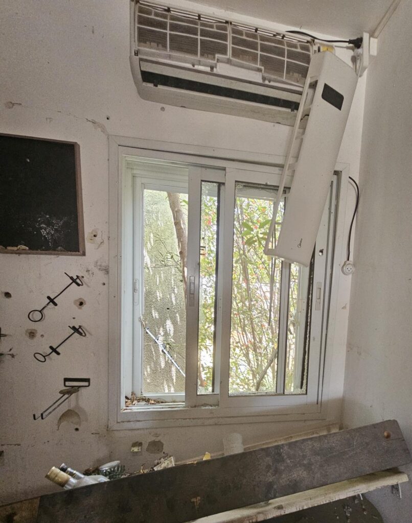A view through a window of a destroyed home at kibbutz Kfar Aza, on Israel’s side of the border with the Gaza Strip in May 2025. Image: Teresa Pirola/Supplied