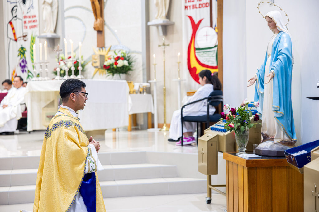 Fr Menard prays in front of the Blessed Virgin Mary during his first Thanksgiving Mass at Mary Immaculate Parish, Bossley Park. Image: Alphonsus Fok/Diocese of Parramatta