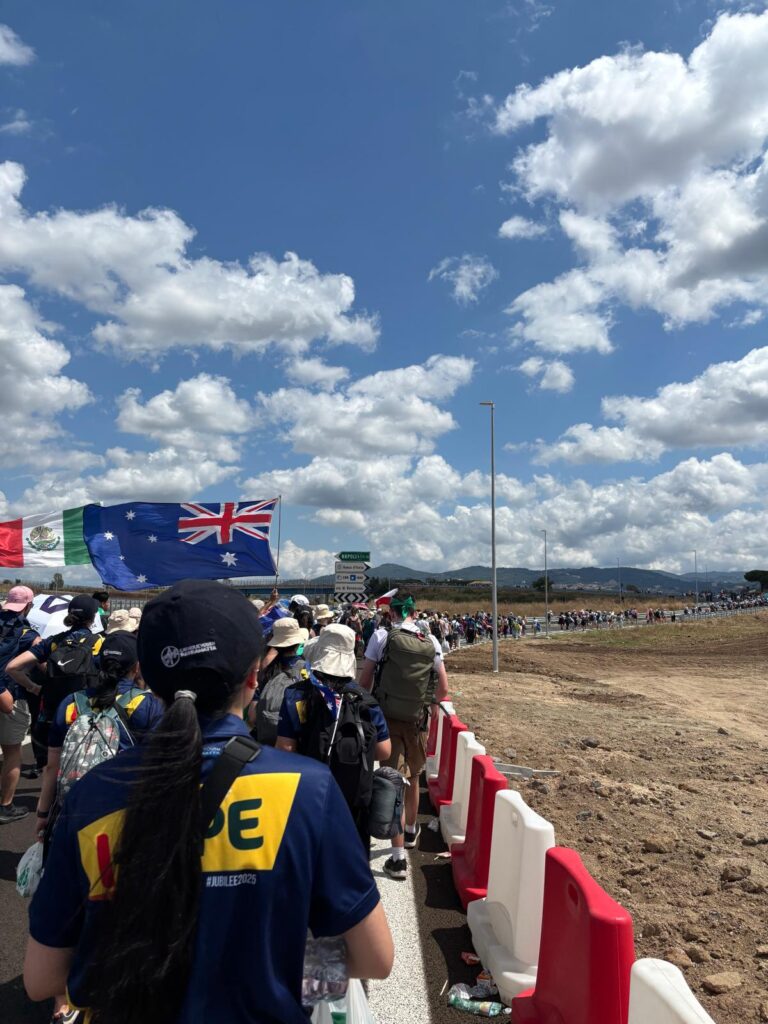 Pilgrims on the walk to Tor Vergata, on the outskirts of Rome, for the Jubilee of Youth Vigil and Mass. Image: Hannah Portelli/Diocese of Parramatta